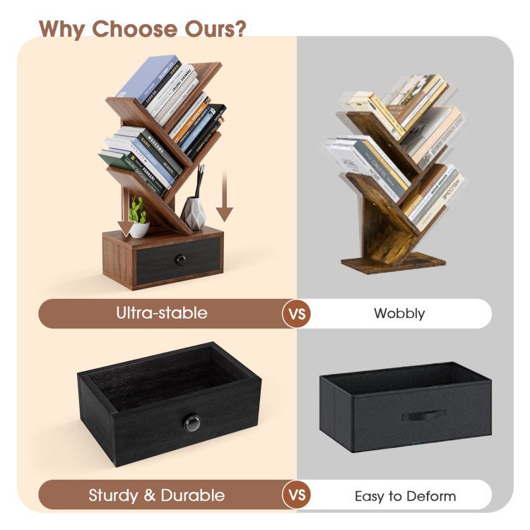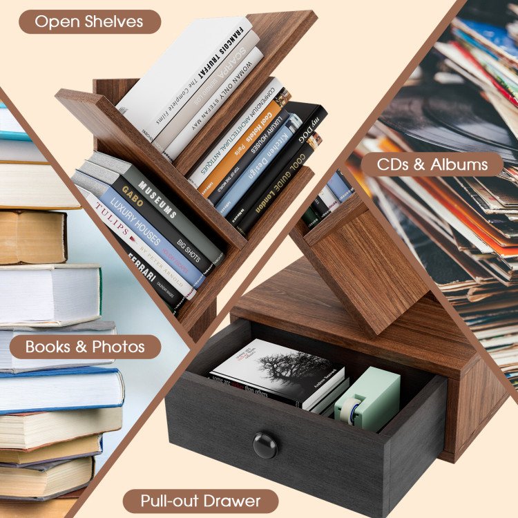 1.Large Storage for Daily Use: The tree bookcase features 5 shelves in total, enabling you to fully utilize them for CDs, 5-10 books, magazines and decorations. Besides, there is also a 9" x 5" x 3" (L x W x H) drawer at the bottom, designed for private storage. Thus, it's an ideal place to accommodate your keys and wallets.