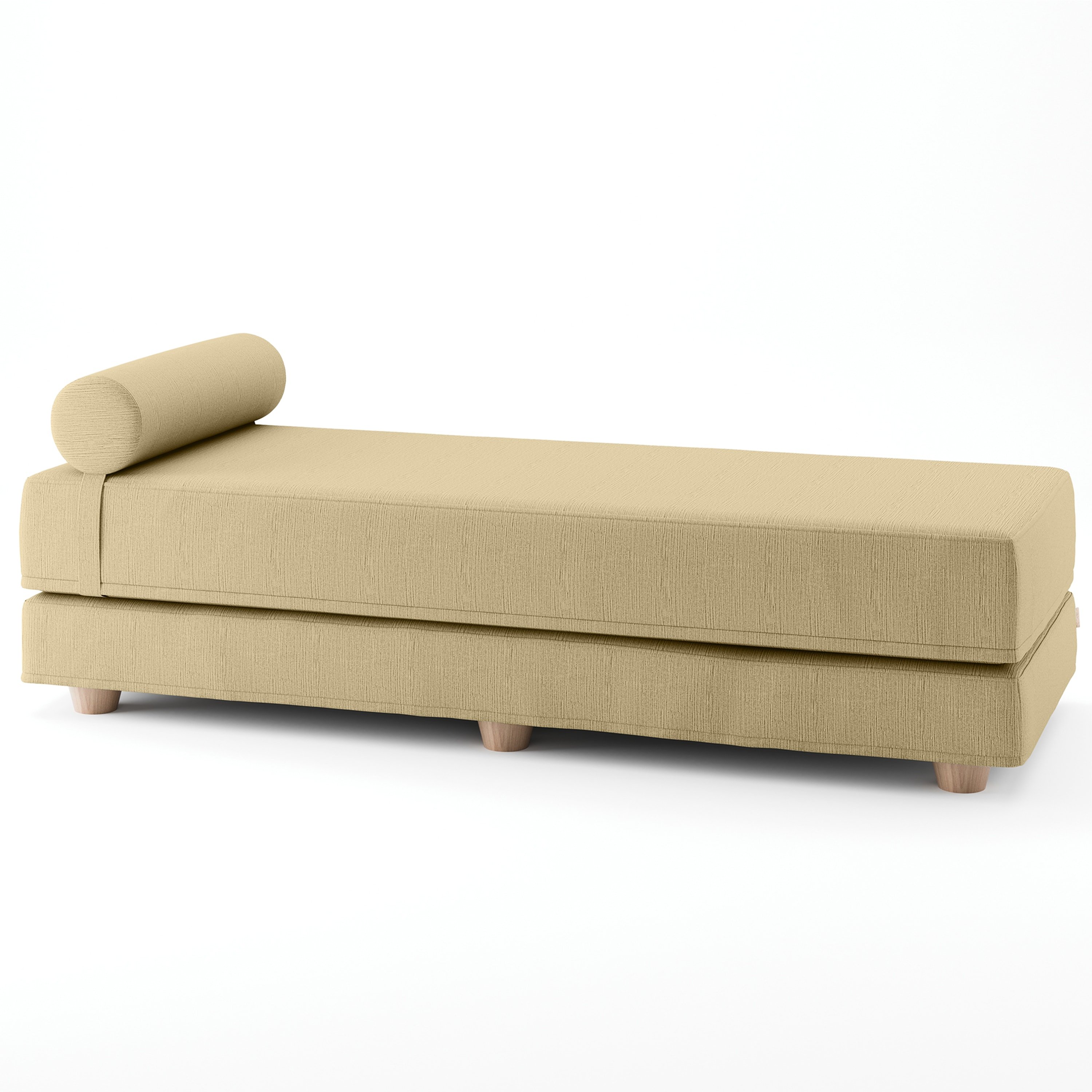 The Alon Daybed is a modern art form for your bedroom, living room, office or den. Crafted with a pair of supportive polyurethane foam platforms with premium soft foam on top, the Alon is a cozy chaise then doubles as a supremely comfy queen-size bed when unfolded. The elegant design of this daybed is elevated with beautiful lathe-turned maple feet that can be secured in a matter of seconds into a hidden wood base. The repositionable elastic strapped bolster complements the streamlined construction.