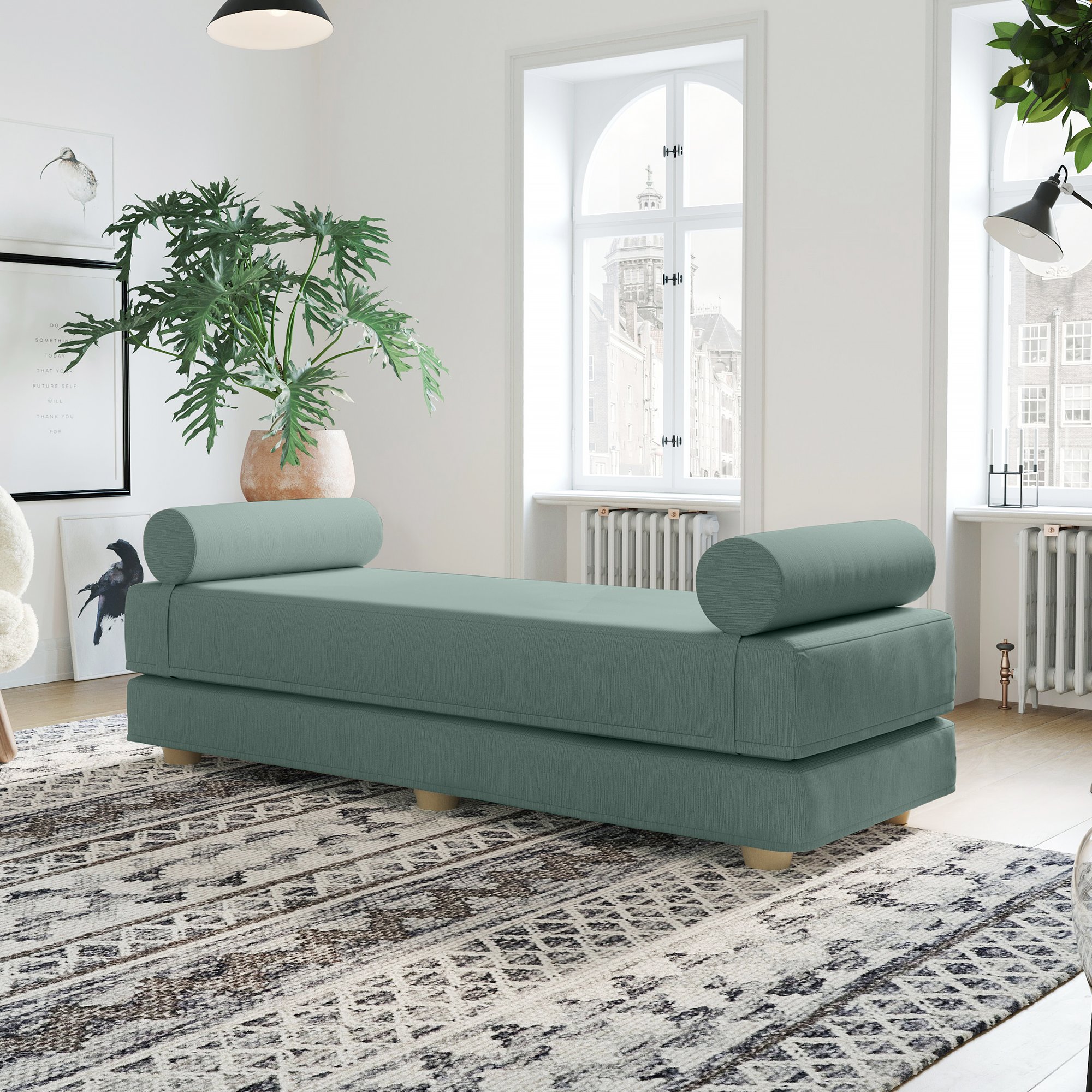 The Alon Daybed is a modern art form for your bedroom, living room, office or den. Crafted with a pair of supportive polyurethane foam platforms with premium soft foam on top, the Alon is a cozy chaise then doubles as a supremely comfy queen-size bed when unfolded. The elegant design of this daybed is elevated with beautiful lathe-turned maple feet that can be secured in a matter of seconds into a hidden wood base. The repositionable elastic strapped bolster complements the streamlined construction.