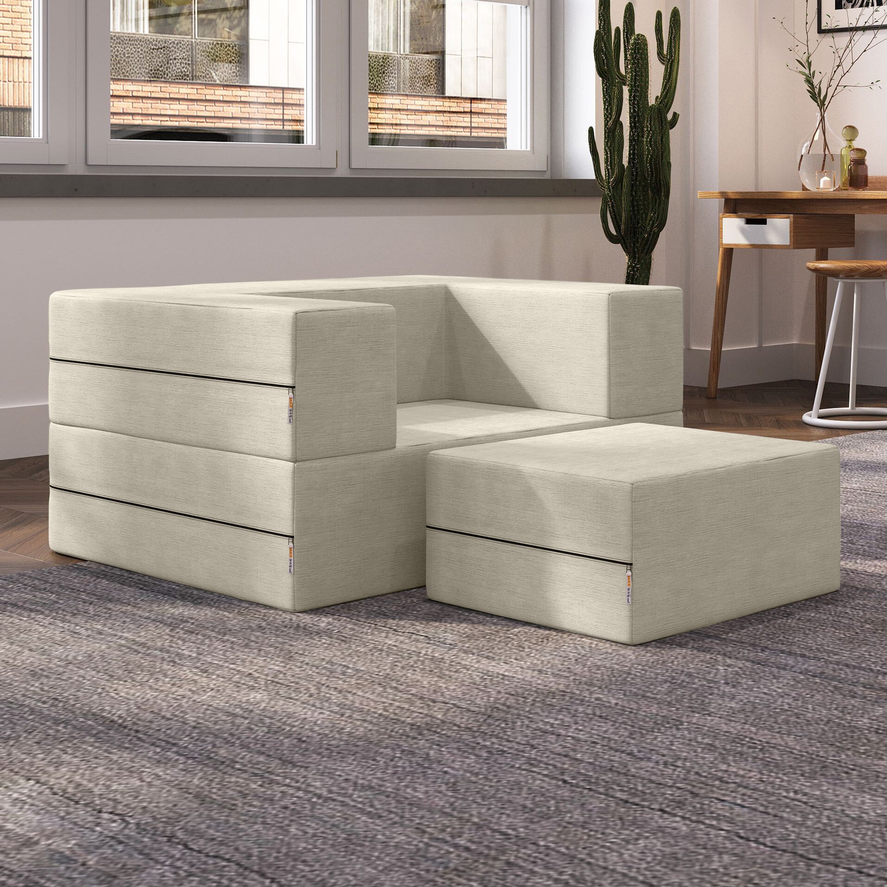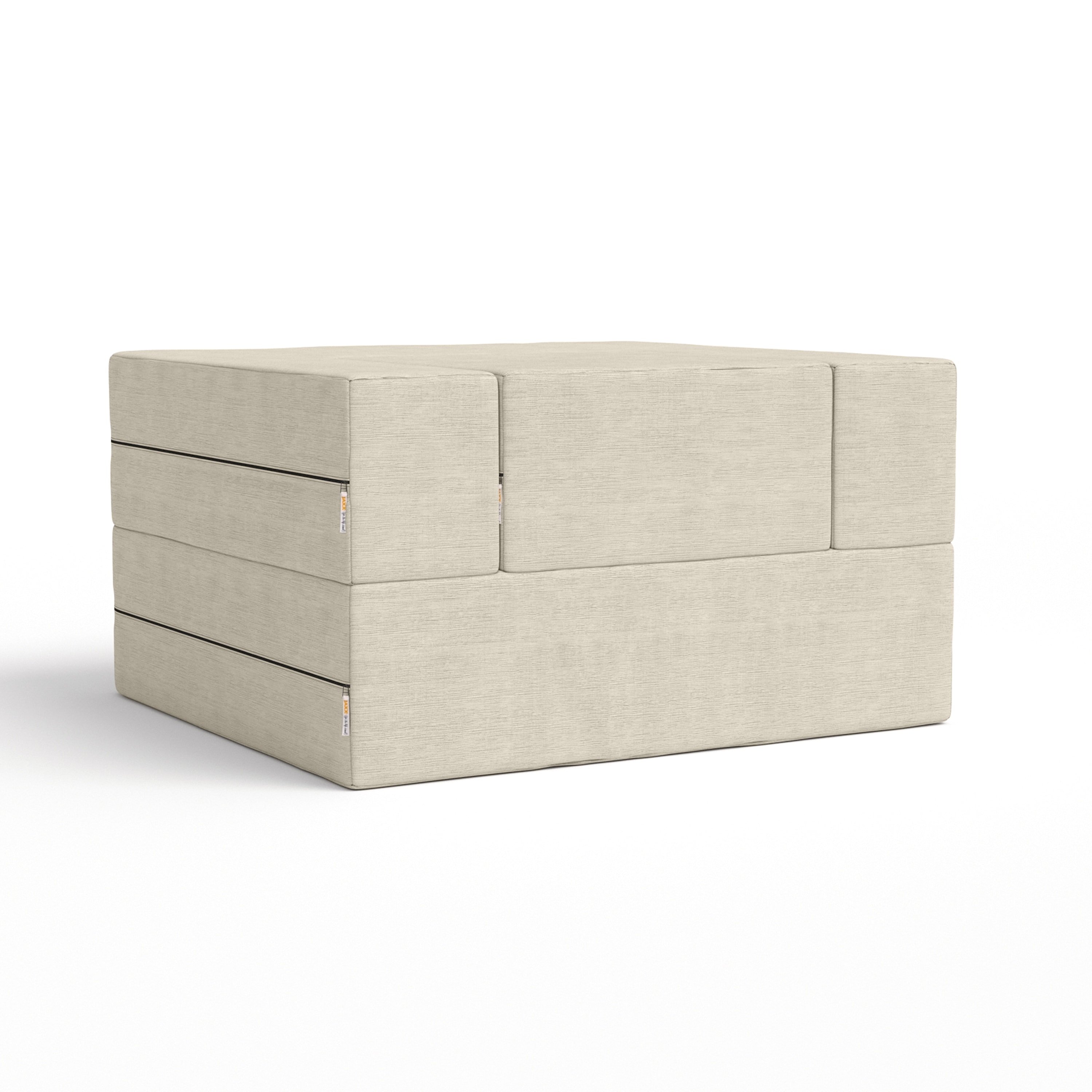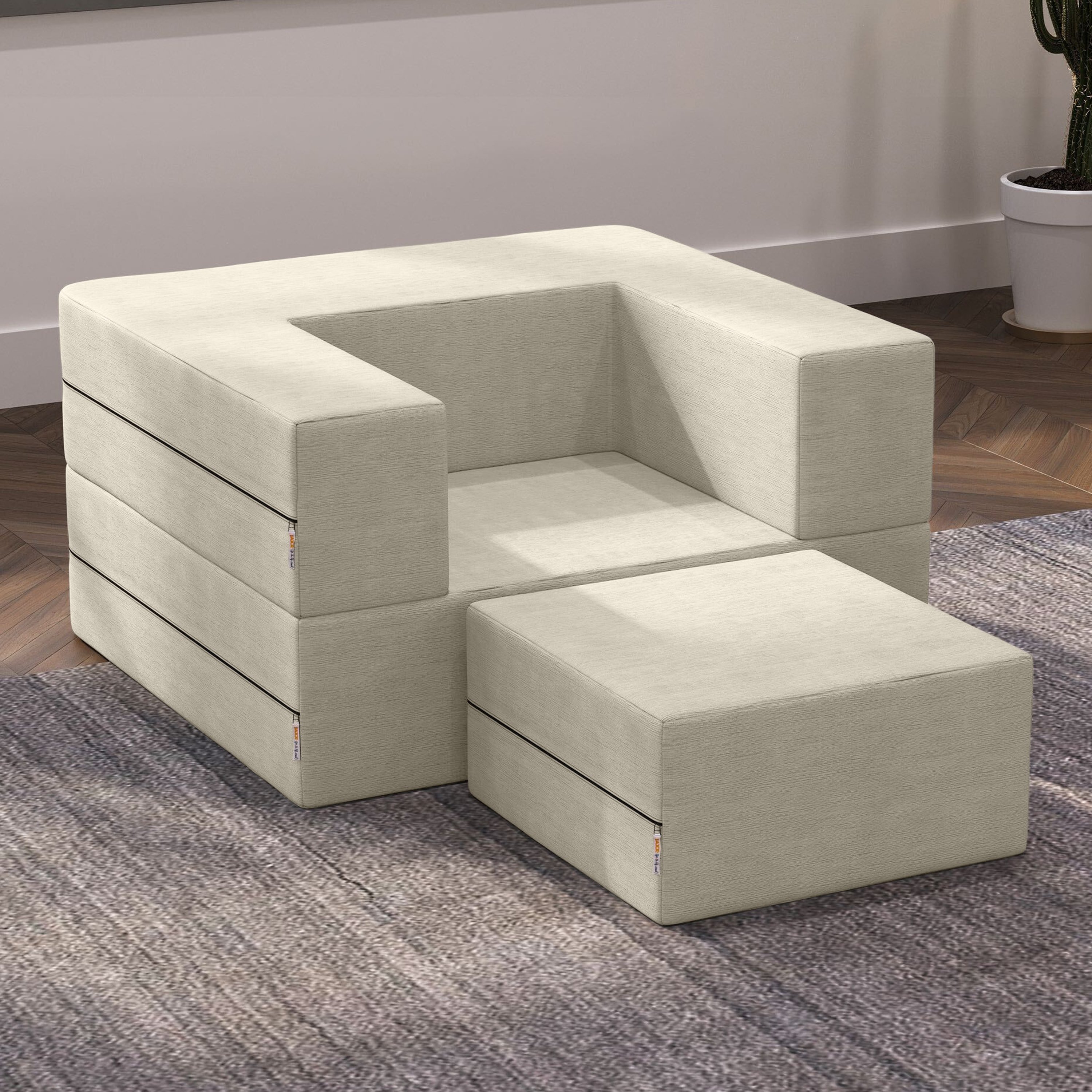 A chair as clever as it is stylish; the Zipline Convertible Sleeper Chair with Ottoman is a fun and functional centerpiece for any room. With its 3-tiered multifunctional design, it creates the perfect layout for your space with the ability to customize quickly and easily. Lounge in its chair form and use the accompanying ottoman to put your feet up. Or, stack the ottoman inside the chair to play cards or use it as a spacious barstool. Even better, fold it out completely and get some sleep on the twin-size mattress. The soft and durable covers are both removable and machine-washable. Care Instructions for Cover: machine-wash with cold water, tumble-dry on low heat.