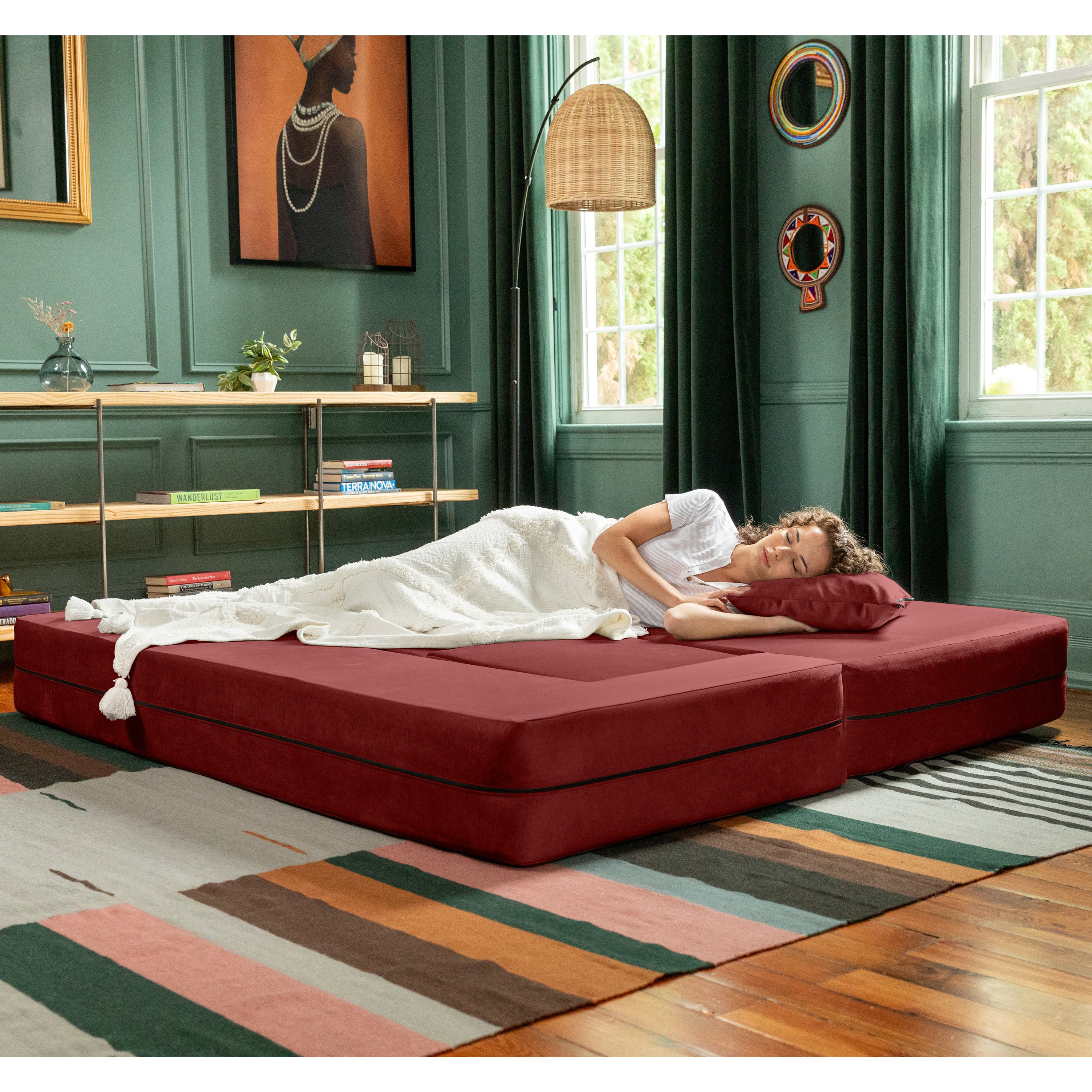 The Zipline Convertible Sleeper Sofa with three accompanying ottomans features a multi-functional “flip” design feature that allows it to adapt to any situation. Relax with friends in a comfortable three-seat sofa with matching ottomans, or stack the ottomans inside for a large bench or game table. Even better, unfold it completely and get some sleep on the comfy California King-size bed. You can also stack one ottoman in the middle to create a built in side-table or workstation while seated. The covers feature stylish black zippers and are removable and machine-washable. Available in a variety of colors, the Zipline will complement your existing decor beautifully. Care Instructions for covers: machine wash with cold water and tumble dry on low heat.