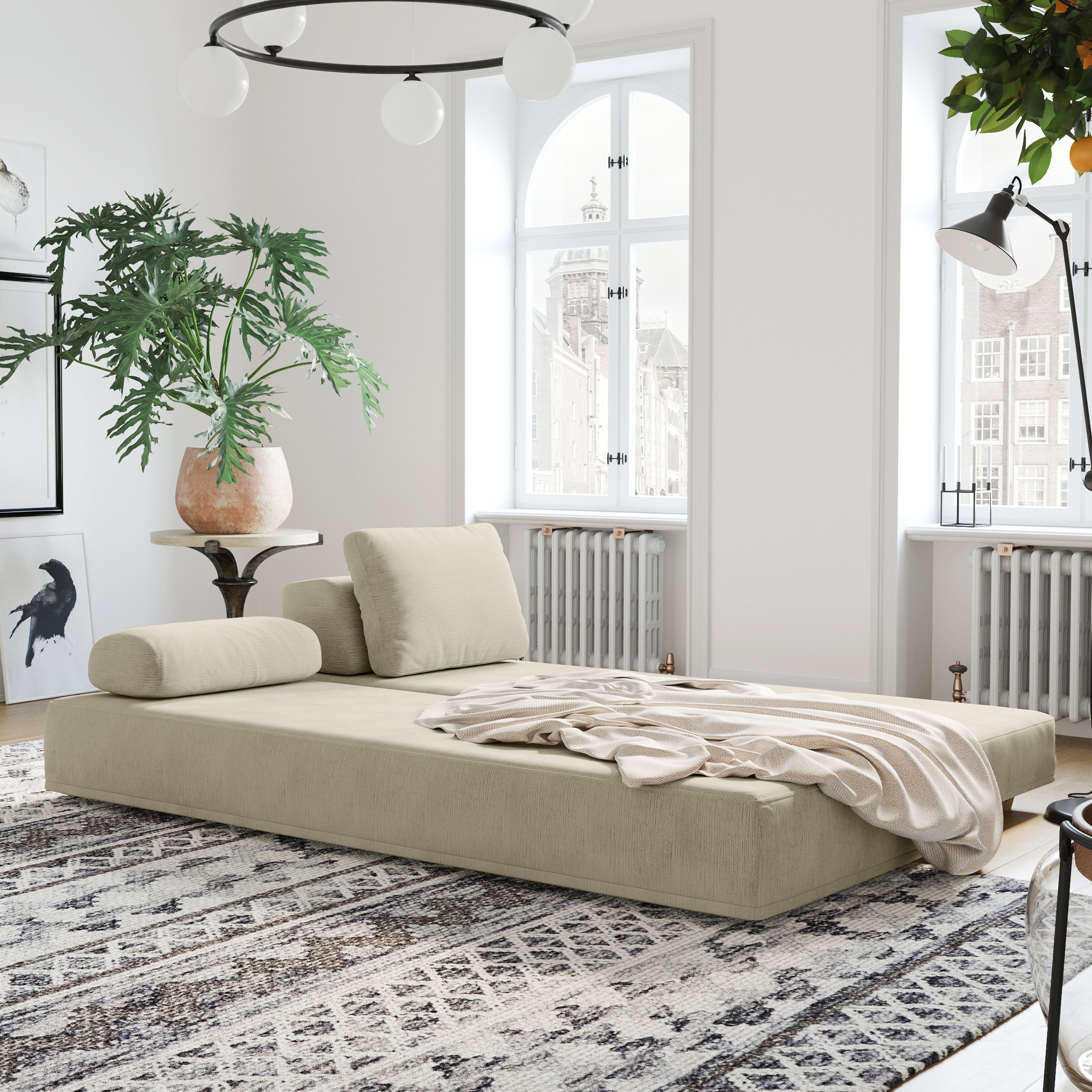 With a modern aesthetic and plush feel, the Balshan Chaise Lounge Daybed puts pull-out couches to shame. This minimalist, convertible lounger consists of five pieces: a cushioned base atop a wooden platform and maple feet, a second cushion stacked on top, a backrest, a pillow, and a bolster. These pieces can be arranged as a cozy seat or bed, and the backrest supports the back, head, or arms. Two extra pillows are included for decoration and even more comfort. The Balshan Chaise Lounge Daybed can be anything you want it to be. When pulled apart, the base and top cushion transform into a queen-size bed for overnight guests. The backrest stays in place thanks to its weighted base and skid-free traction underside. With multiple arrangement options, the Balshan is as flexible as your needs.