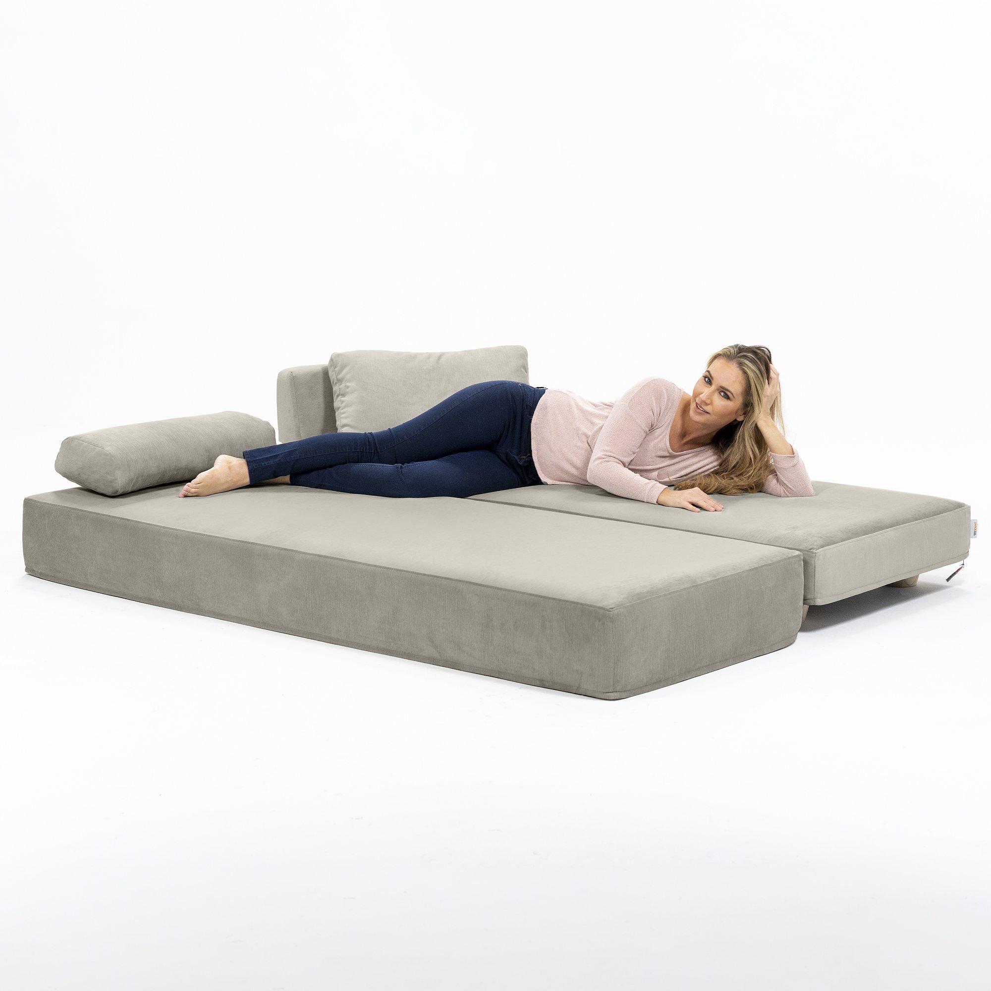 With a modern aesthetic and plush feel, the Balshan Chaise Lounge Daybed puts pull-out couches to shame. This minimalist, convertible lounger consists of five pieces: a cushioned base atop a wooden platform and maple feet, a second cushion stacked on top, a backrest, a pillow, and a bolster. These pieces can be arranged as a cozy seat or bed, and the backrest supports the back, head, or arms. Two extra pillows are included for decoration and even more comfort. The Balshan Chaise Lounge Daybed can be anything you want it to be. When pulled apart, the base and top cushion transform into a queen-size bed for overnight guests. The backrest stays in place thanks to its weighted base and skid-free traction underside. With multiple arrangement options, the Balshan is as flexible as your needs.