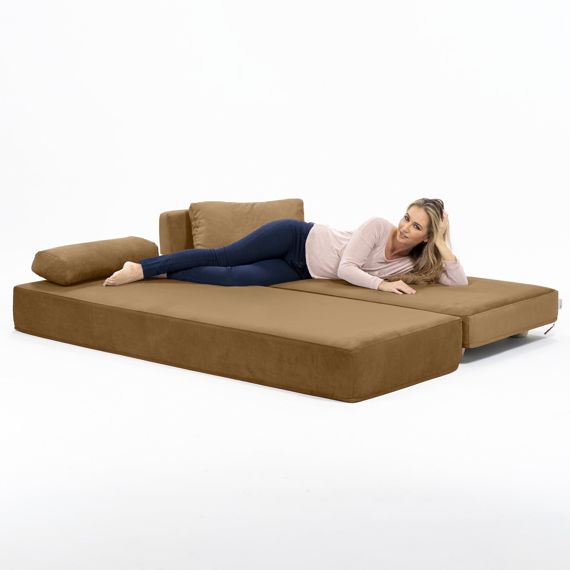 With a modern aesthetic and plush feel, the Balshan Chaise Lounge Daybed puts pull-out couches to shame. This minimalist, convertible lounger consists of five pieces: a cushioned base atop a wooden platform and maple feet, a second cushion stacked on top, a backrest, a pillow, and a bolster. These pieces can be arranged as a cozy seat or bed, and the backrest supports the back, head, or arms. Two extra pillows are included for decoration and even more comfort. The Balshan Chaise Lounge Daybed can be anything you want it to be. When pulled apart, the base and top cushion transform into a queen-size bed for overnight guests. The backrest stays in place thanks to its weighted base and skid-free traction underside. With multiple arrangement options, the Balshan is as flexible as your needs.