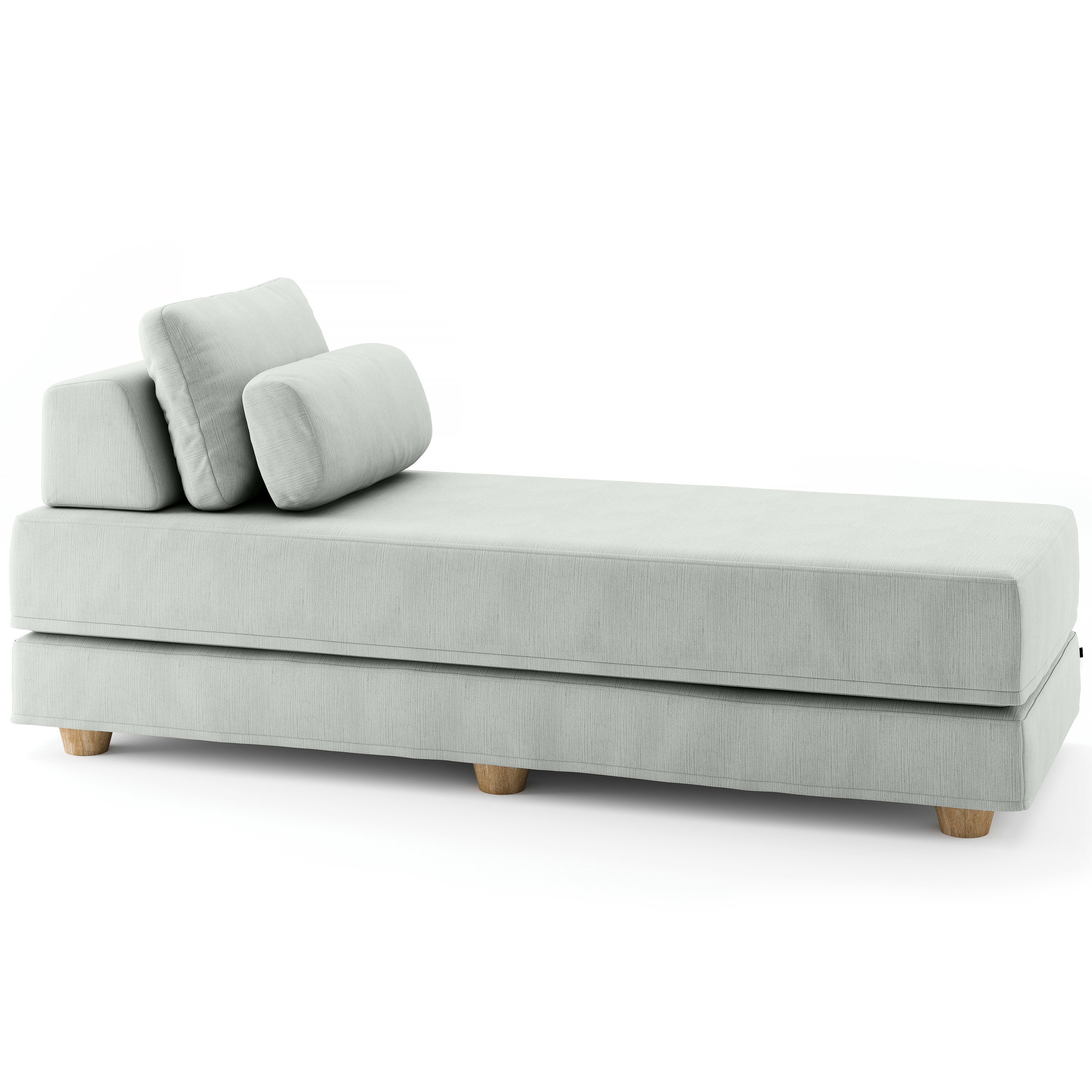 With a modern aesthetic and plush feel, the Balshan Chaise Lounge Daybed puts pull-out couches to shame. This minimalist, convertible lounger consists of five pieces: a cushioned base atop a wooden platform and maple feet, a second cushion stacked on top, a backrest, a pillow, and a bolster. These pieces can be arranged as a cozy seat or bed, and the backrest supports the back, head, or arms. Two extra pillows are included for decoration and even more comfort. The Balshan Chaise Lounge Daybed can be anything you want it to be. When pulled apart, the base and top cushion transform into a queen-size bed for overnight guests. The backrest stays in place thanks to its weighted base and skid-free traction underside. With multiple arrangement options, the Balshan is as flexible as your needs.