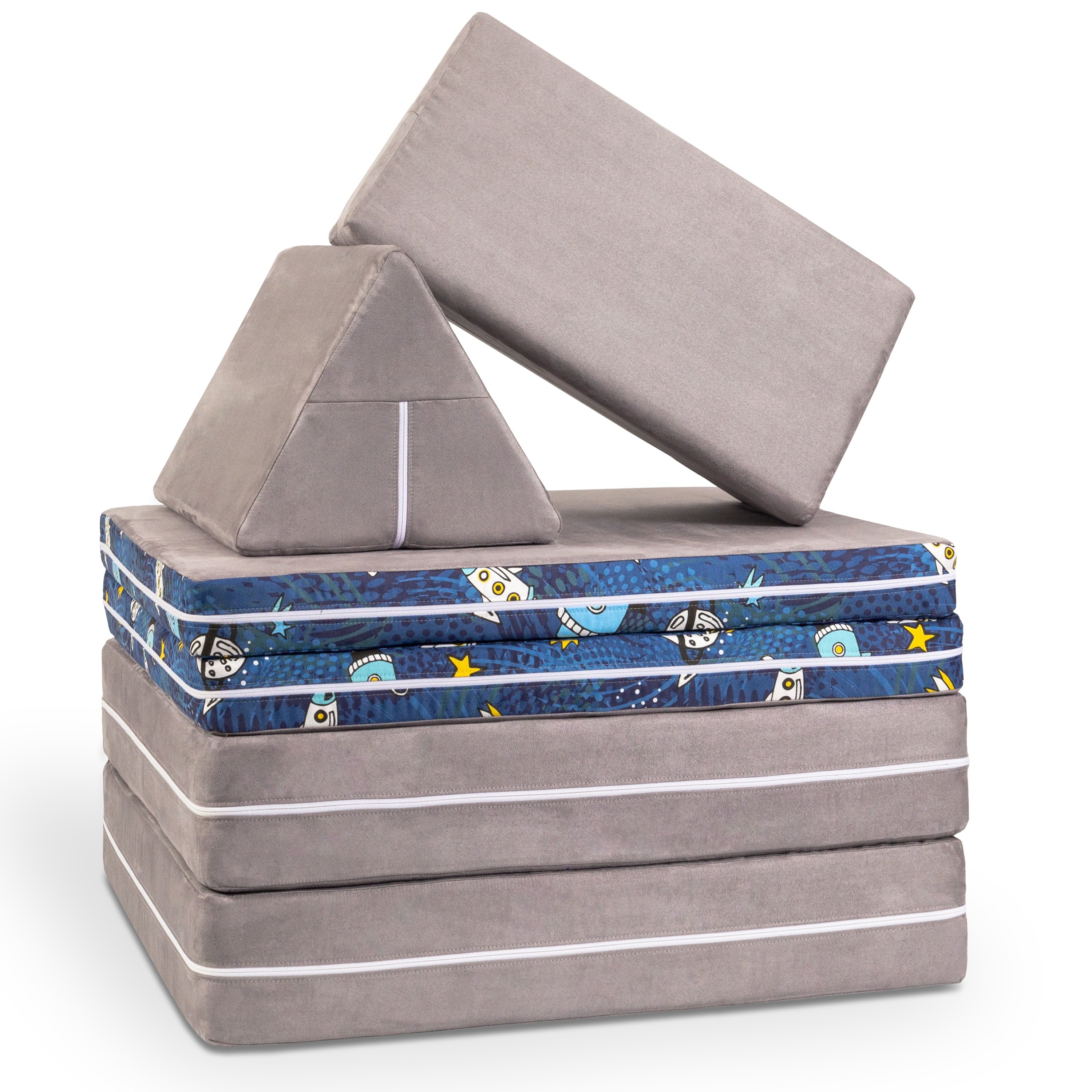The Zipline PlayScape convertible kids' play couch was created with active and inventive play at heart, but its comfy cushions make for a cozy reading, napping, or lounging spot too! It is designed to inspire the imagination with the ability to create caves, pirate ships, houses, tunnels, and more! Make a play castle complete with a bastion and slides; create obstacle courses to climb on, jump off, and explore — the Zipline PlayScape will keep your kids occupied for hours on end. Our newest microsuede prints featuring rainbows, mermaids, spaceships, and dinosaurs are sure to spark adventure and creativity.