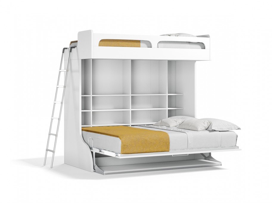 The perfect solution for a growing family or an additional sleeping space for your guests. Castello is an ultimate space saver that will fit in the smallest apartment without taking up a lot of valuable floor space. Twin over full Murphy bunk bed. Built-in deep shelves on the back wall for additional storage. Self-leveling desk stays level with the floor when the lower bed is open. Sturdy aluminum ladder for easy access to the top bunk. Innovative ergonomic gas shocks ensure effortless one-handed operation of the Murphy bed. Slat mattress support system for extended comfort. *The mattresses are not included. Full and Twin size mattresses are sold separately. Up to an 8” thick full-size mattress should be used for the lower bunk. 6" thick twin-size mattress - is for the upper bunk. MADE IN EUROPE